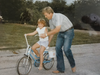 This is Alyssa and her dad 27 years later on her first day to have the training wheels come off, same age as I was, in Kindergarten. We heard the same words a few times come out of her mouth...."let go, I can do it by myself," followed by some crying and frustrating rants, then joyful celebration once she went a little ways by herself.
